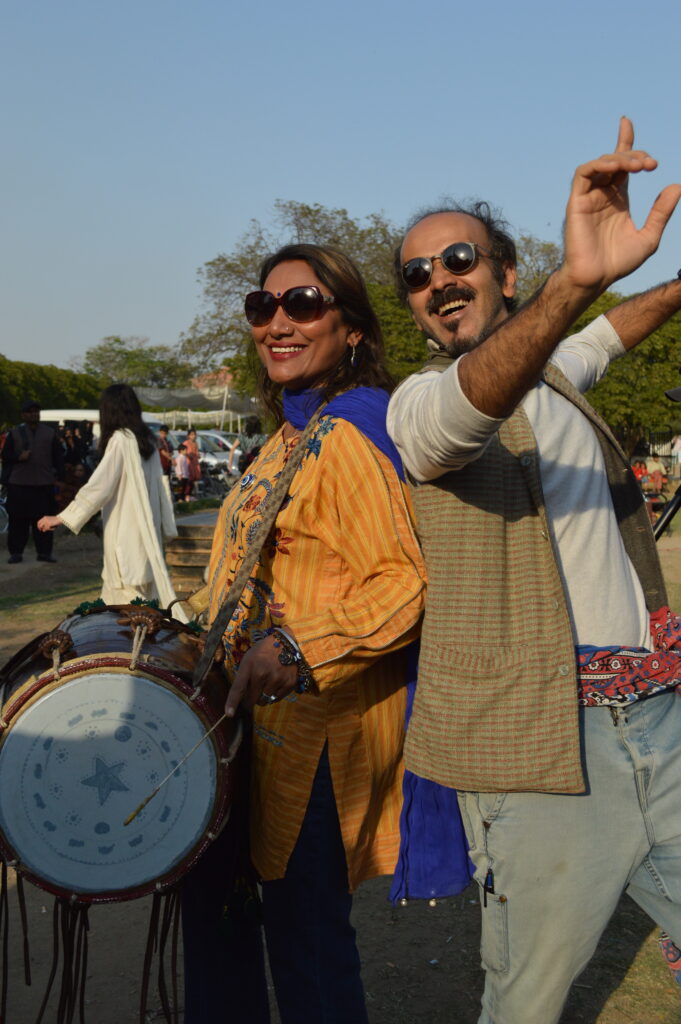 -A joyful duo sharing the energy of the day, drumming up the spirit of the Aurat March