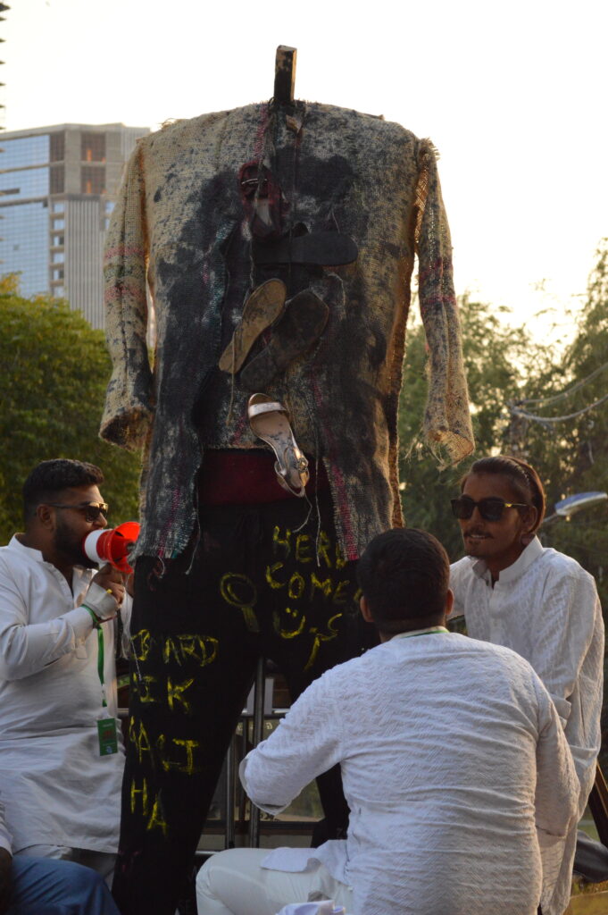 -A headless, ragged mannequin symbolizing ‘Pidar Shah’ (patriarchy), being taken to Teen Talwar from Frere Hall, where the protestors will march to, and burn the mannequin to mark the day’s culmination. ‘Burning the symbolic ‘putla’ (mannequin) of patriarchy is an emotional, rage-filled, and cathartic moment for us,’ says one of the protestors.